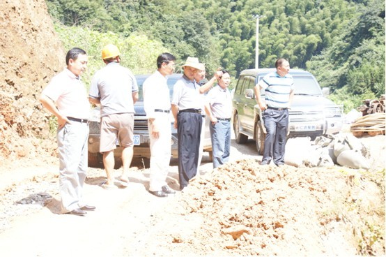 图为肖局长在桃源县太平铺乡察看被毁林区公路修复现场