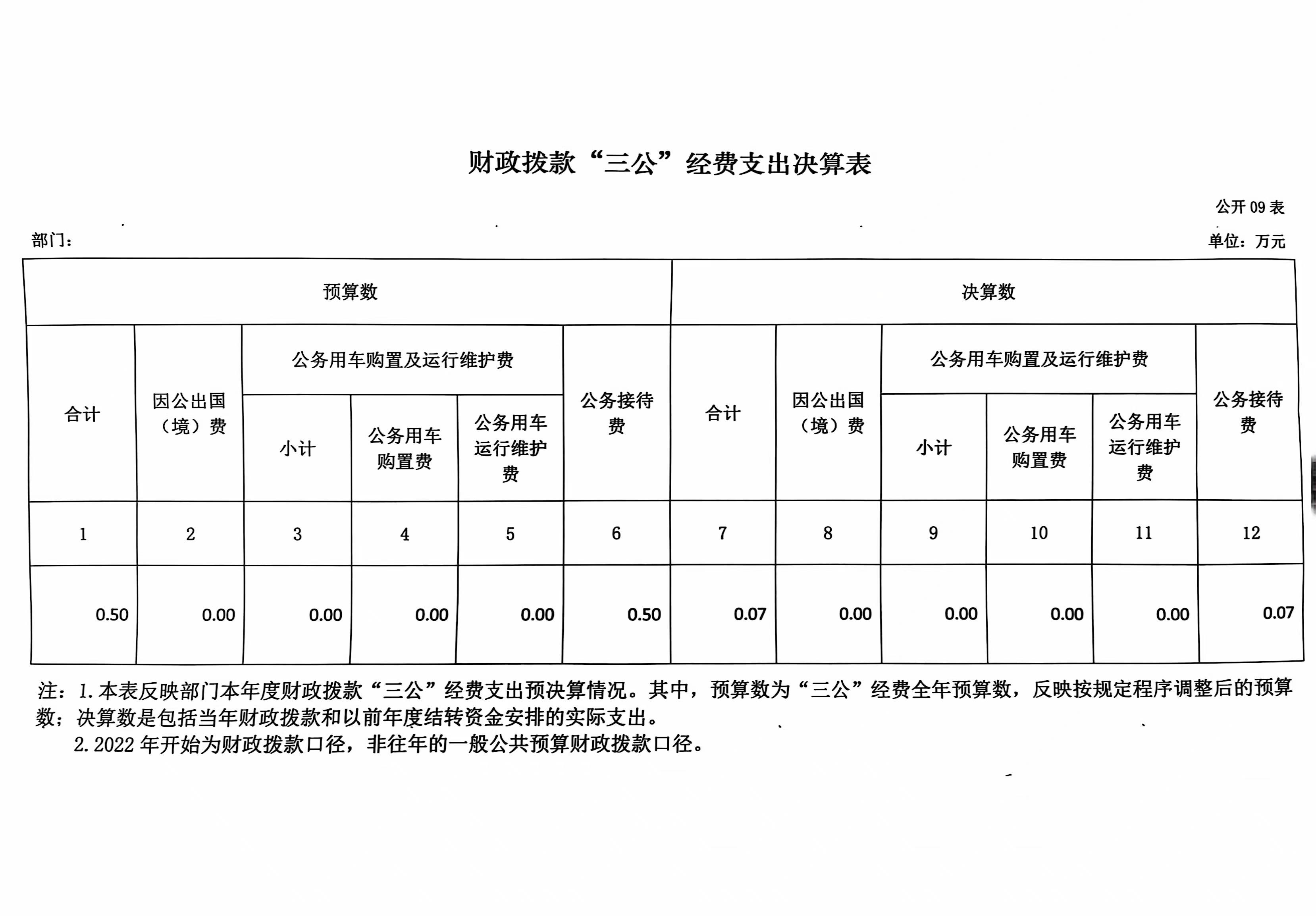 2023年度“三公”经费财政拨款支出决算中,公务接待费支出决算0.07万元,占100%,因公出国(境)费支出决算0万元,占0%,公务用车购置费及运行维护费支出决算0万元,占0%。其中: